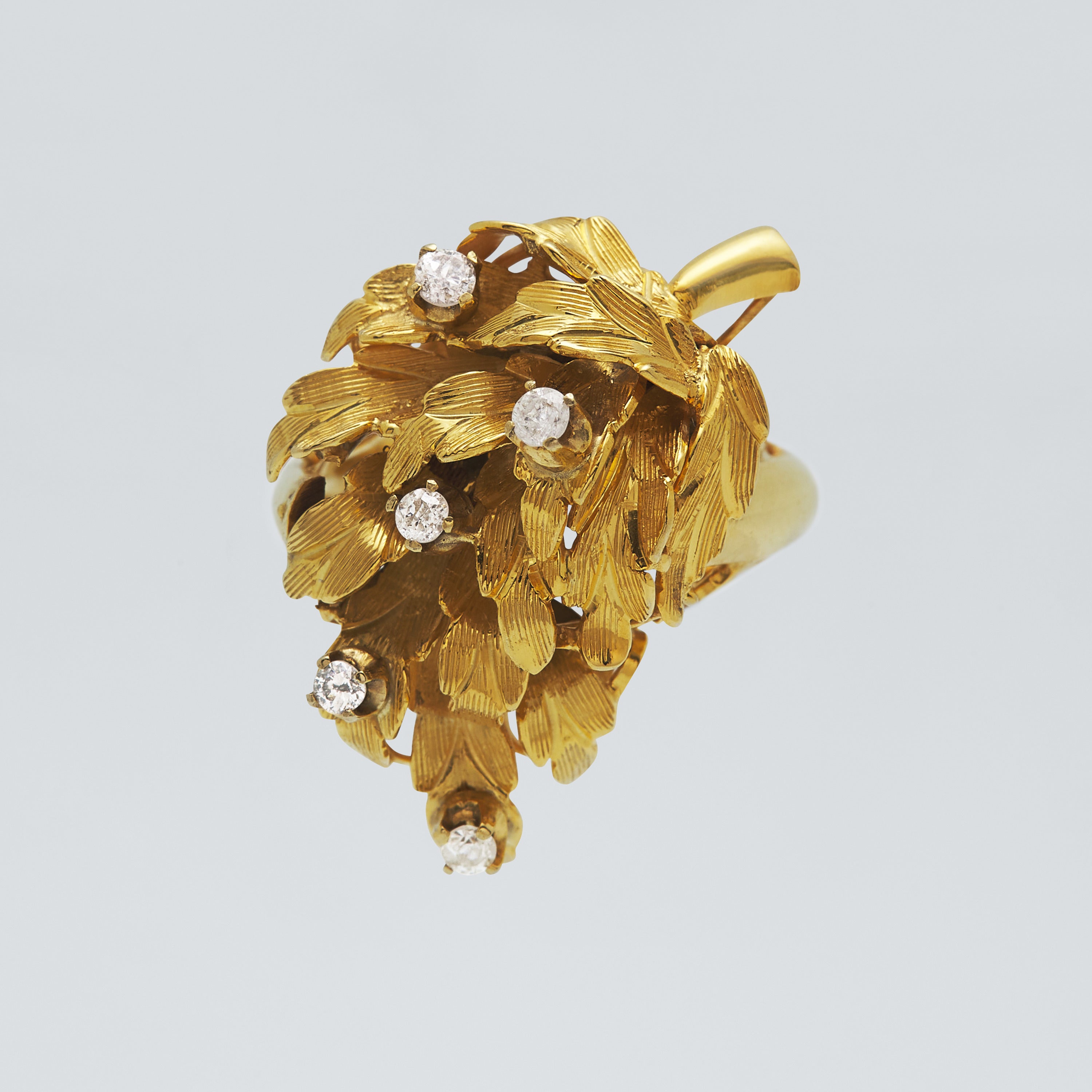 The brooch, worn as a pendant or pinned to fabric, is an elegant cascade of brushed gold leaves—fluid in form yet grounded in weight. The earrings echo this gentle cluster in a wearable scale, and the ring adds a sculptural statement, resizable for comfort and fit. Together, they speak of abundance, of natural elegance, and the timeless beauty of things well made.