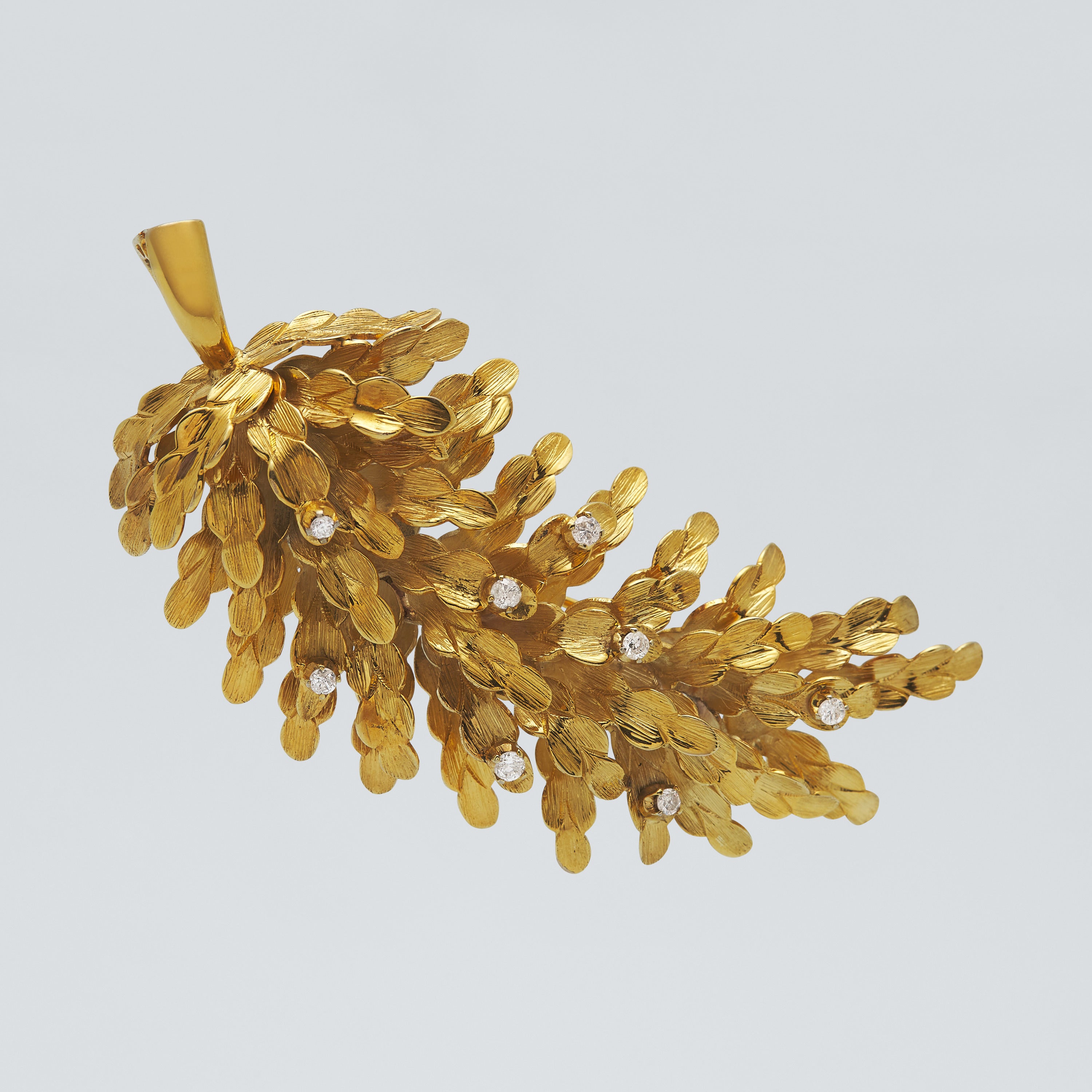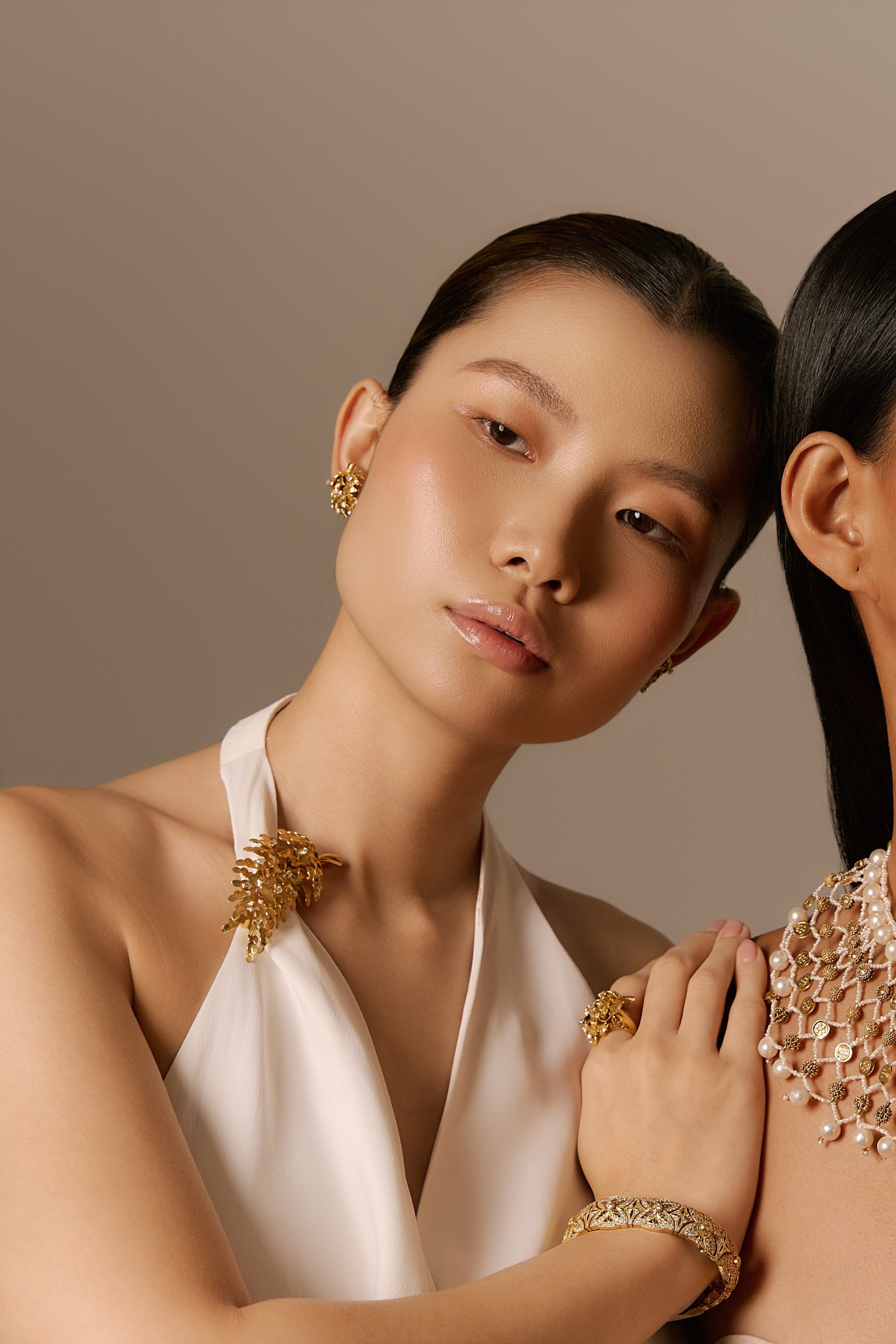 Inspired by the quiet splendor of leaves in golden light, the Aurelia Set is a three-piece composition of brooch/pendant, earrings, and ring—each piece textural, sculptural, and light-catching. Handcrafted in rich 18K gold and finished with scattered natural diamonds and brilliant-cut crystals, the pieces shimmer like dewdrops on morning foliage.