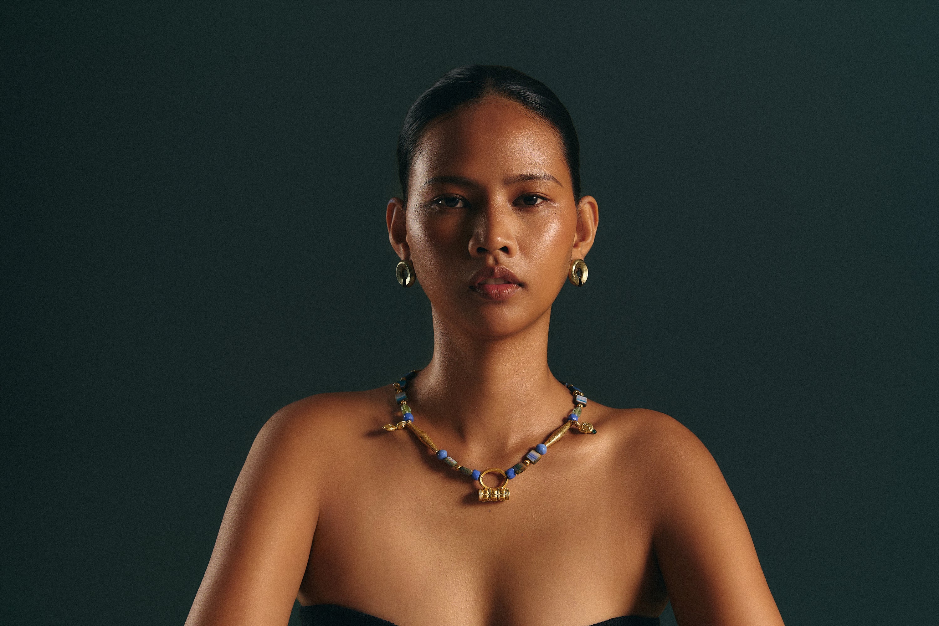 The Estella Necklace is a bold study in contrast and rhythm—where moonstone rounds, faceted glass, and striped enamel squares meet with deliberate tension. Elongated gold-finished forms add warmth and movement, while a central pendant, inspired by pre-colonial gold weights, grounds the piece in quiet strength.