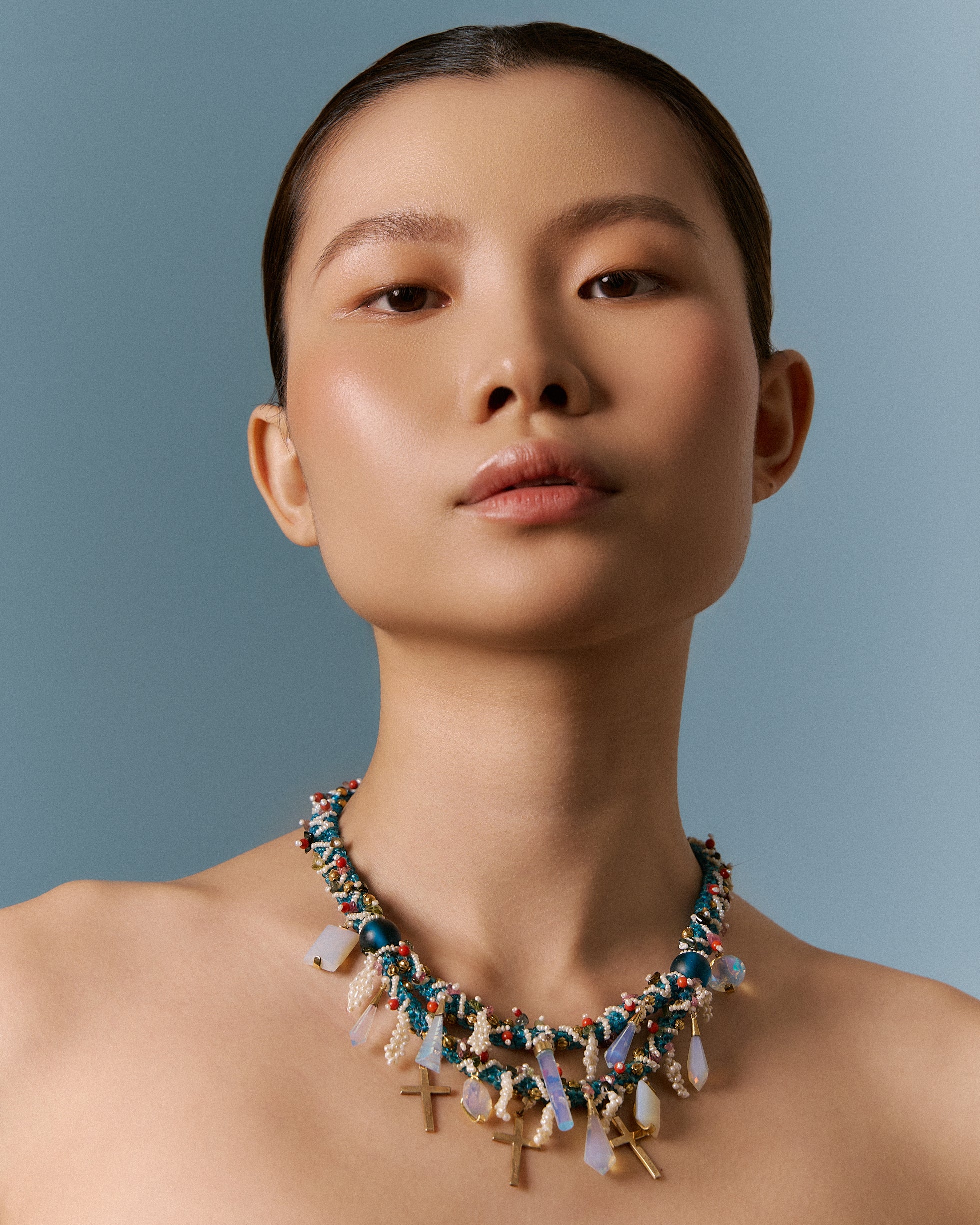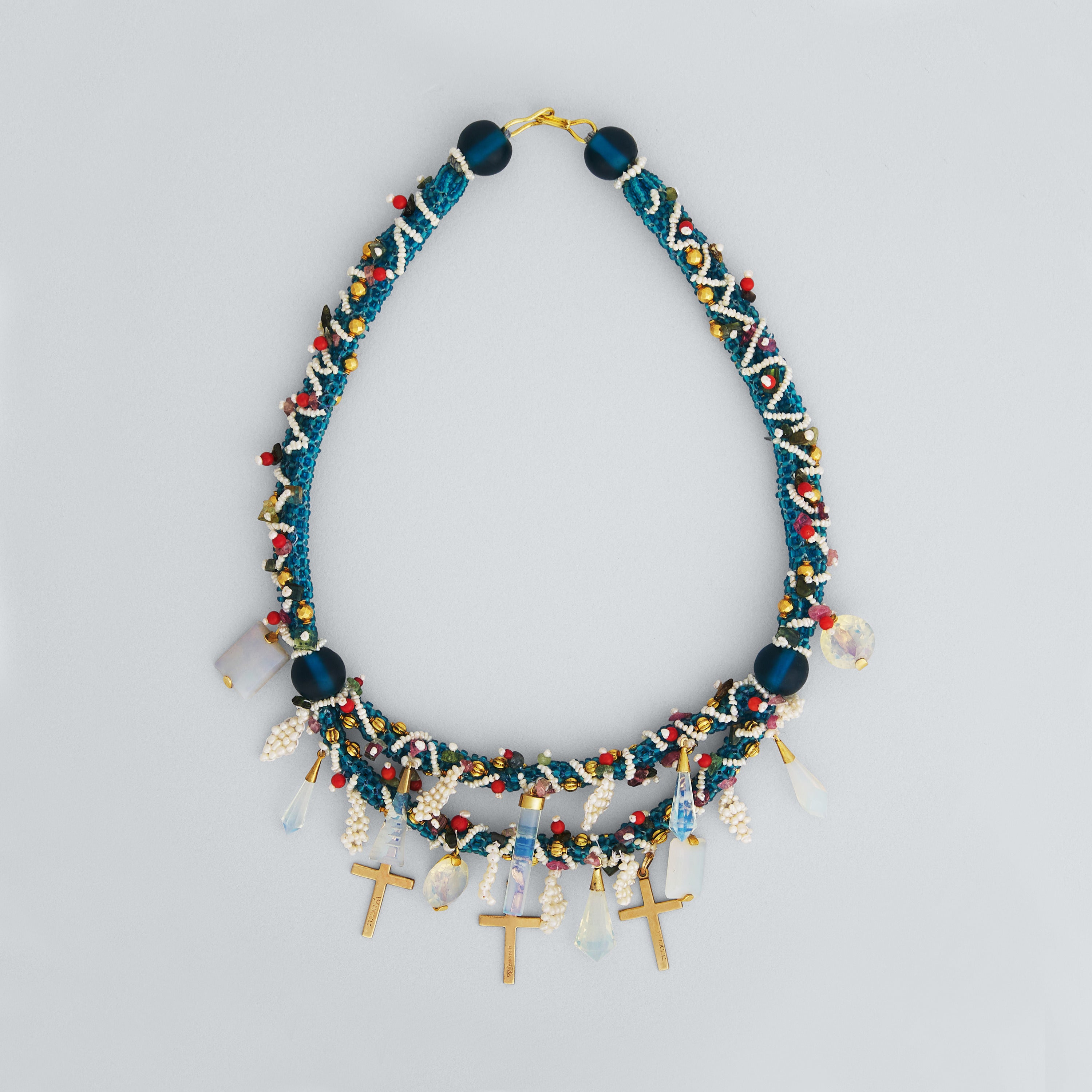 Lucia weaves antique aqua seed beads, moonstones, sapphire glass, and 10k gold cross dangles into a strand that feels sculptural, soulful, and quietly bold. One-of-a-kind, expressive, and heirloom-inspired.